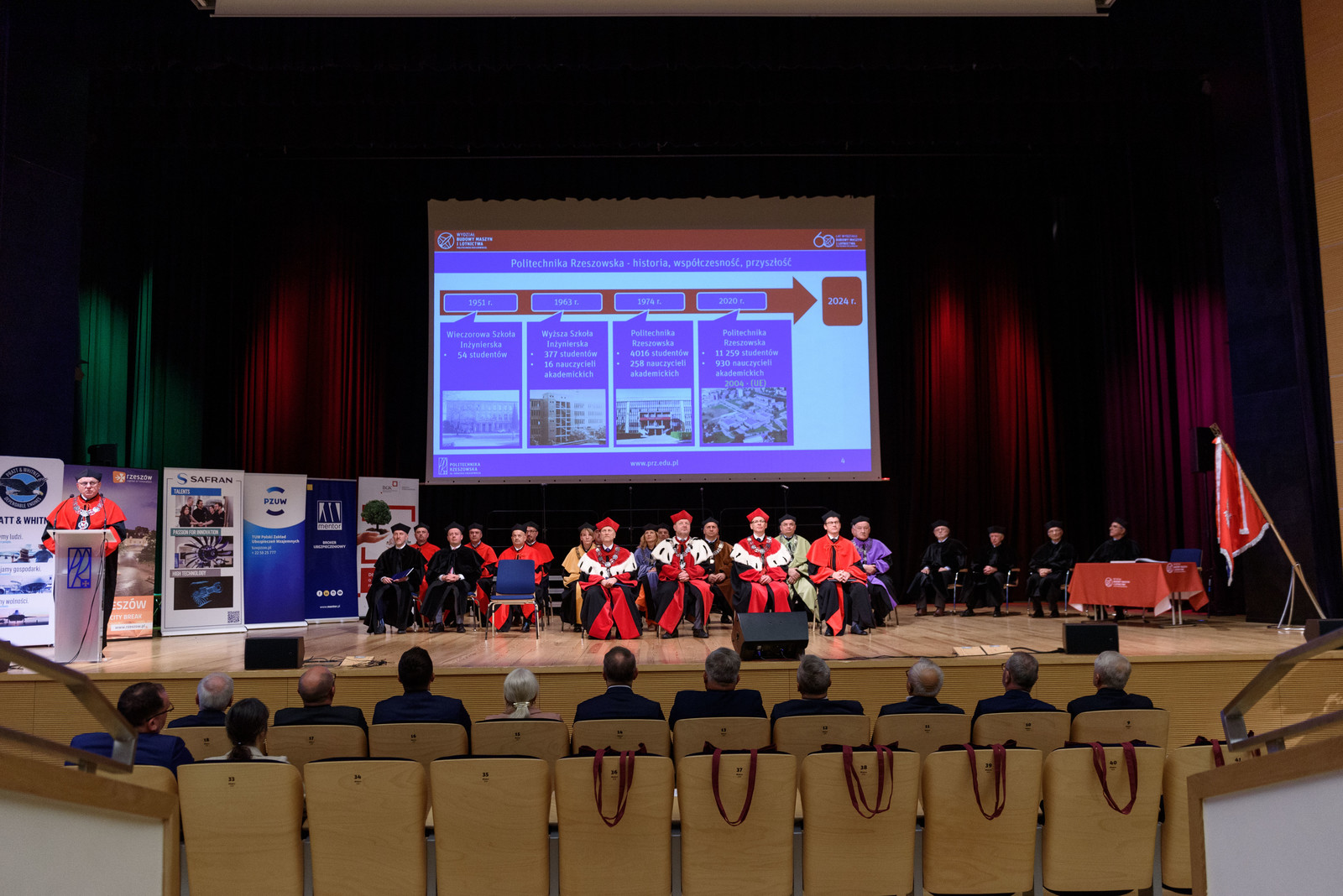 Dziekan prof. PRz A. Marciniec przedstawił historię Wydziału Budowy Maszyn i Lotnictwa, kolejne lata rozwoju, zasługi i sukcesy pracowników i studentów. Omówił strukturę wydziału, którą stanowi 10 katedr i 2 zakłady obejmujące typowe obszary dla dyscyplin inżynieria mechaniczna oraz inżynieria materiałowa. Największe z nich to: Katedra Inżynierii Lotniczej i Kosmicznej, Katedra Technologii Maszyn i Inżynierii Produkcji, Katedra Konstrukcji Maszyn. Podkreślił, że znakomita i nowoczesna baza naukowa, w tym wyjątkowe w skali Europy laboratoria, pozwalają prowadzić badania dla wielu gałęzi przemysłu. Zaprezentowano także film zrealizowany na podstawie archiwalnych materiałów TVP Oddział Rzeszów.