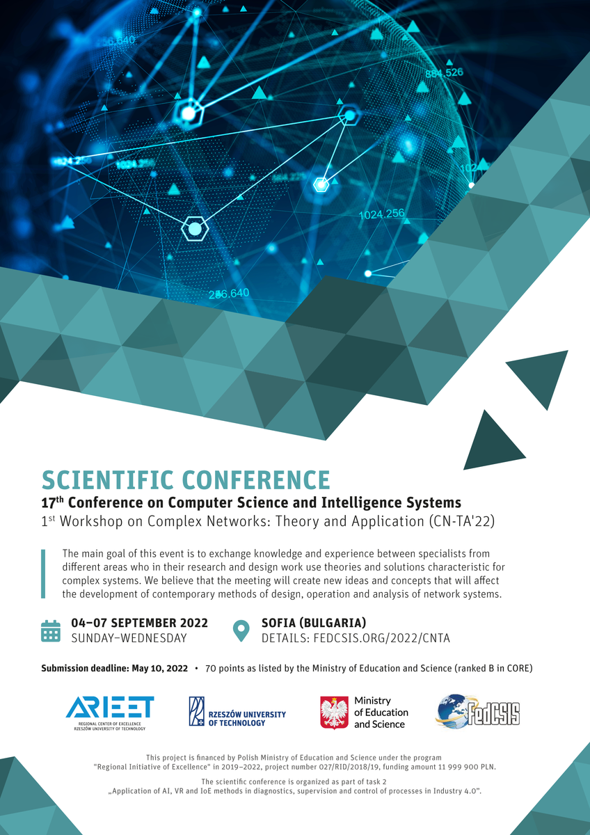 Politechnika Rzeszowska włączyła się w organizację warsztatu „1st Workshop on Complex Networks: Theory and Application” (CN-TA'22) w ramach międzynarodowej konferencji FedCSIS. Wydarzenie odbędzie się w trybie hybrydowym w Sofii (Bułgaria) 4-7 września br. Konferencja jest indeksowana w kategorii B rankingu CORE. Zgodnie z komunikatem MEiN z 21 grudnia 2021 r. artykuły, które zostaną opublikowane w materiałach pokonferencyjnych, otrzymają 70 pkt.